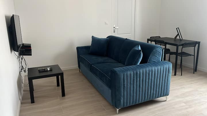 Cuisine équipée, salon séjour avec canapé convertible style rapido , chambre lit 2 places