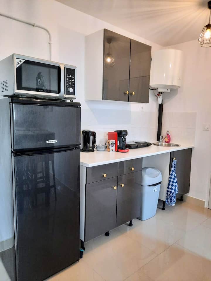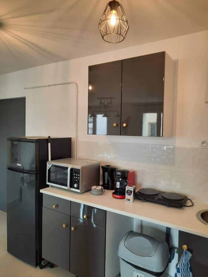 Vous avez également à disposition une machine à café et une bouilloire , vous avez bien sûr accès à quelques sachets de thé et quelques dosettes de café et bien sûr des bouteilles d’eau.