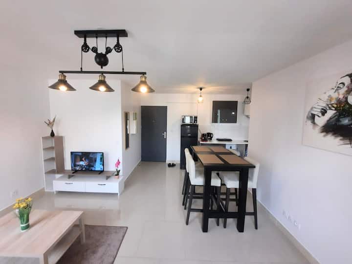 Le logement Cosy est situé dans une zone pavillonnaire, c’est un quartier paisible où vous pouvez être en parfaite sécurité, contrôle d’accès extérieur et ascenseur sécurisé,