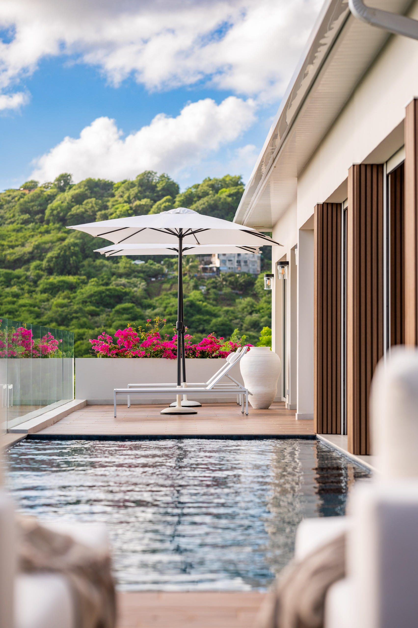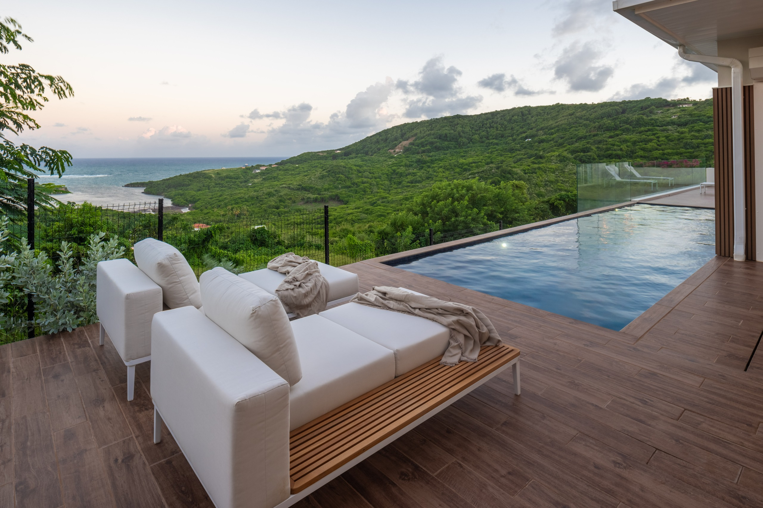 Surplombant la baie de Cap Macré, la villa Malawi II est implantée sur un site naturel d’exception, protégé pour sa beauté. Sa piscine de 10 mètres semble se fondre avec l’horizon marin, offrant un point de vue exceptionnel.